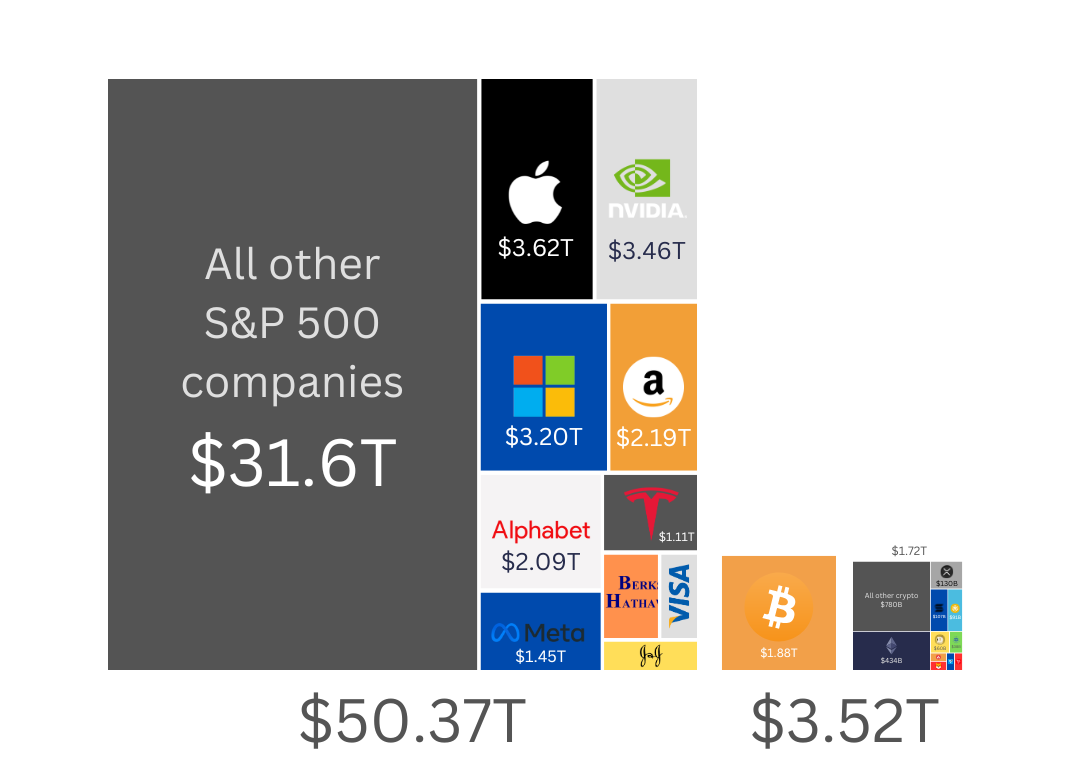 While the entire crypto market cap stands at $3.62 trillion, the S&P 500 dwarfs it with a staggering $50.37 trillion. The top 10 S&P 500 companies alone, including Apple ($3.62T), Microsoft ($3.20T), and Amazon ($2.19T), command more than the entire crypto market combined.